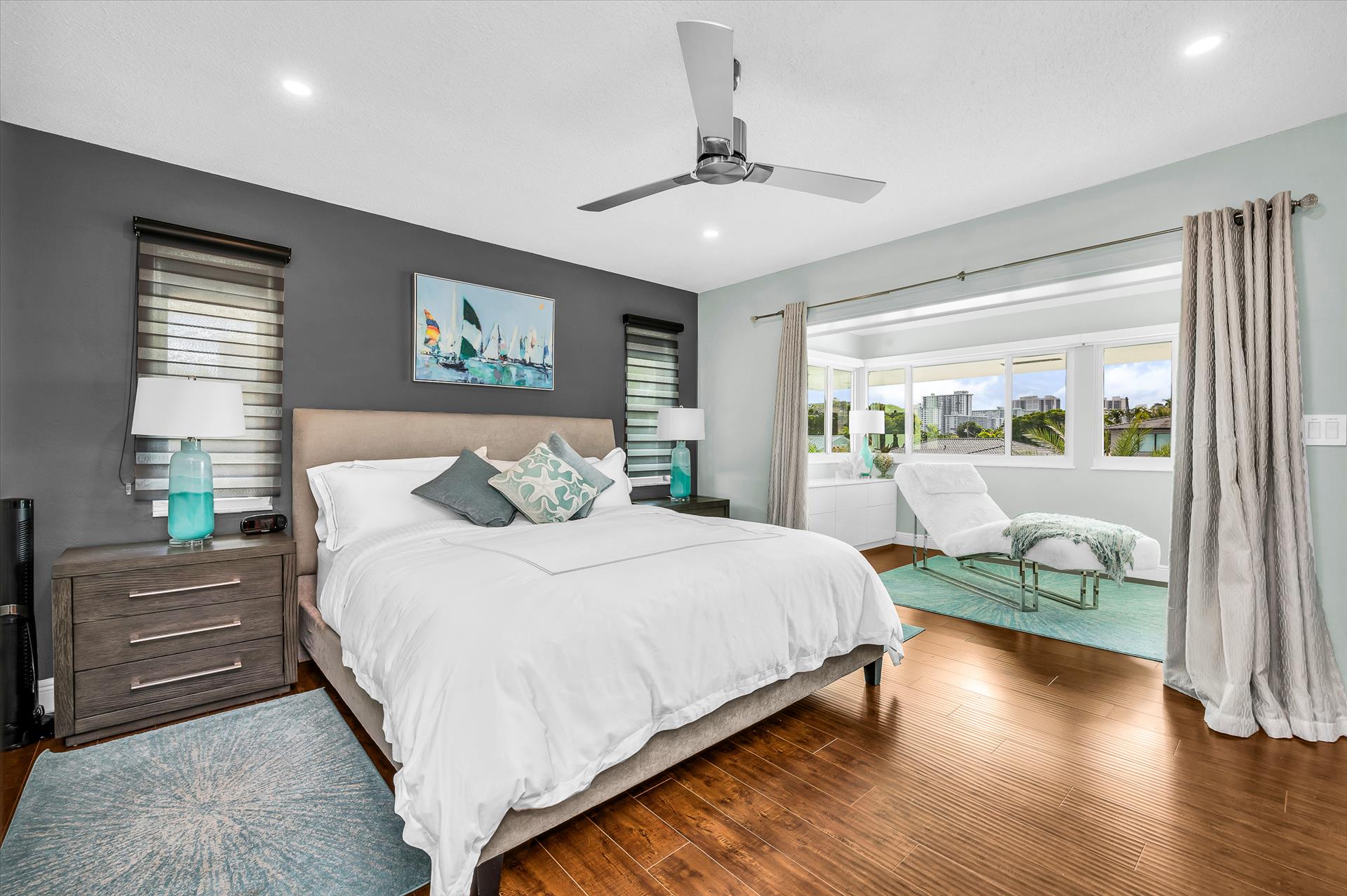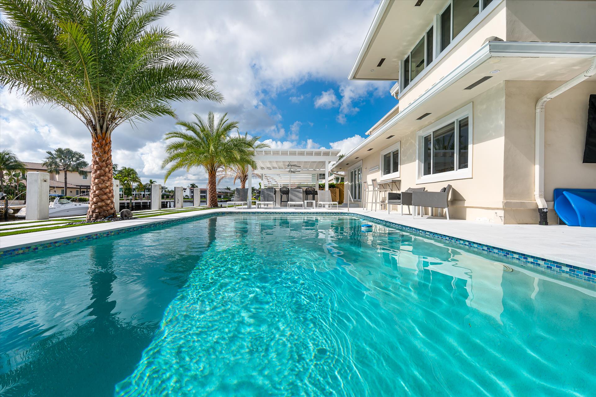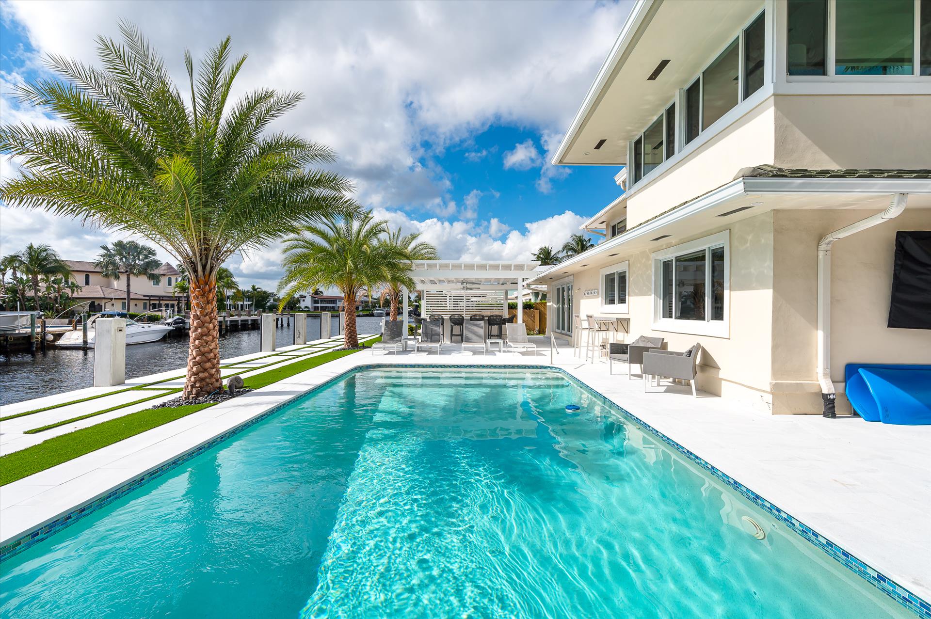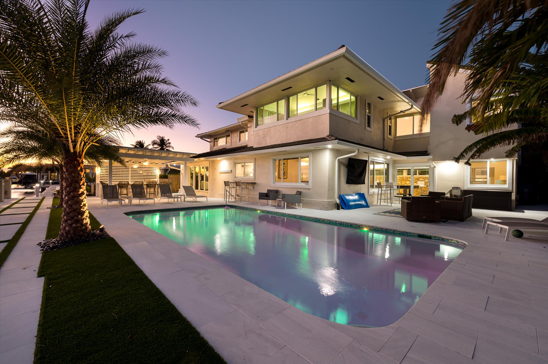 This exquisite property is a definition of a perfect vacation spot ! Outstanding two level waterfront house features 5 bedrooms, 4 bathrooms, designated office space, entertaining area, heated pool and endless list of high end amenities. Modern designer furniture and sleek chef's fully equipped kitchen will make you feel at home away from home. House boasts with a downstairs guest en-suite queen size bedroom, while offering 3 guest bedrooms and a primary resort type suite upstairs. Master bedroom is featuring plush King size bed, soaking bath and a customized bathroom with a walking shower. Heated pool, new modern dock, summer kitchen, plush sitting area with TV, along with outside dining and beautiful night time lightning make this house a true gem for those, who truly appreciate the perks of water front living!
