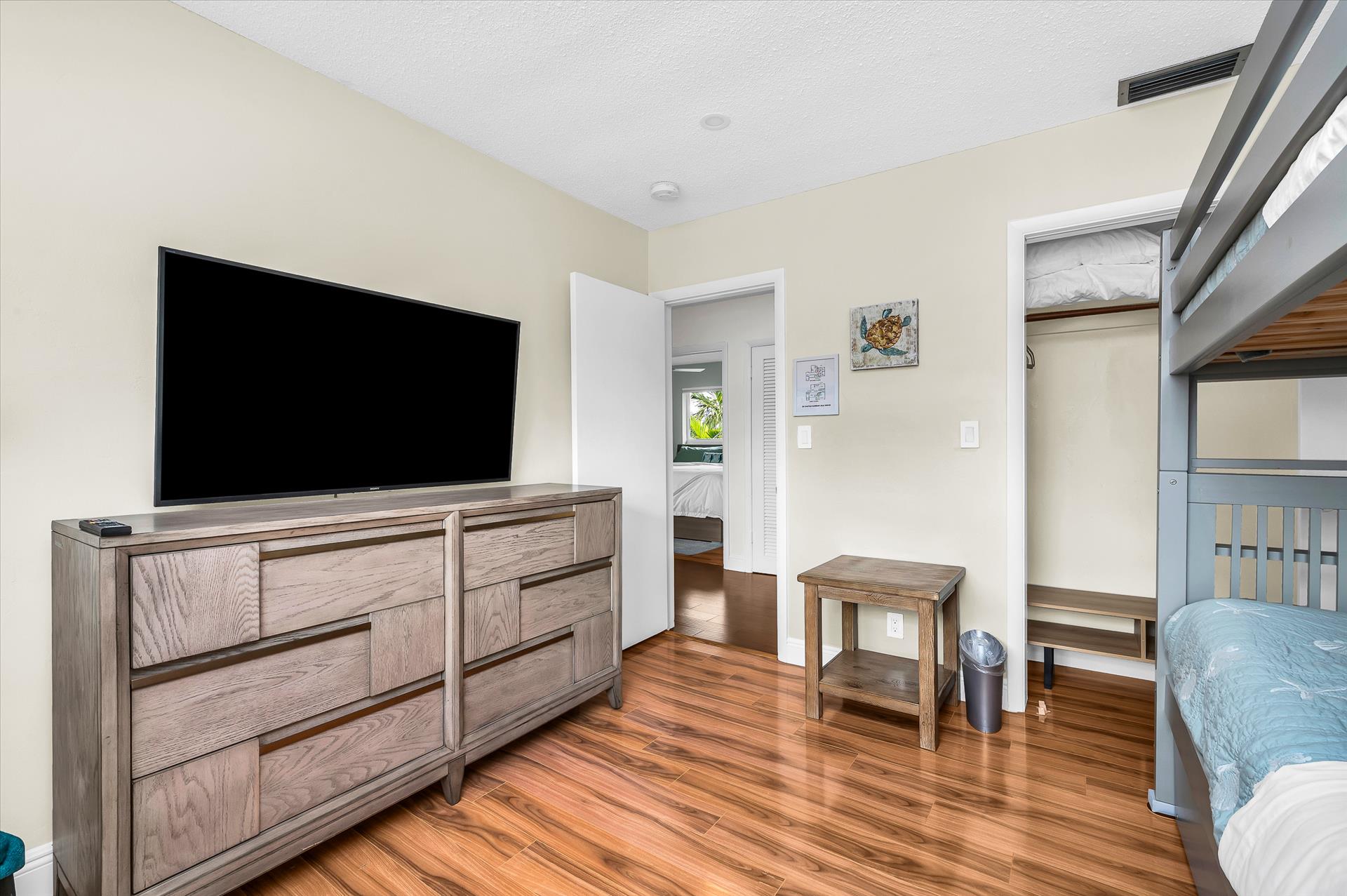 Upstairs : King size guest bedroom#1, King size guest bedroom# 2, Bunk bed guest bedroom# 3 with 3 full size sleeping beds, King size Primary Suite ; 1 full bath with a walk-in shower, 1 full Primary bath with a soaking tub and walk-in shower.