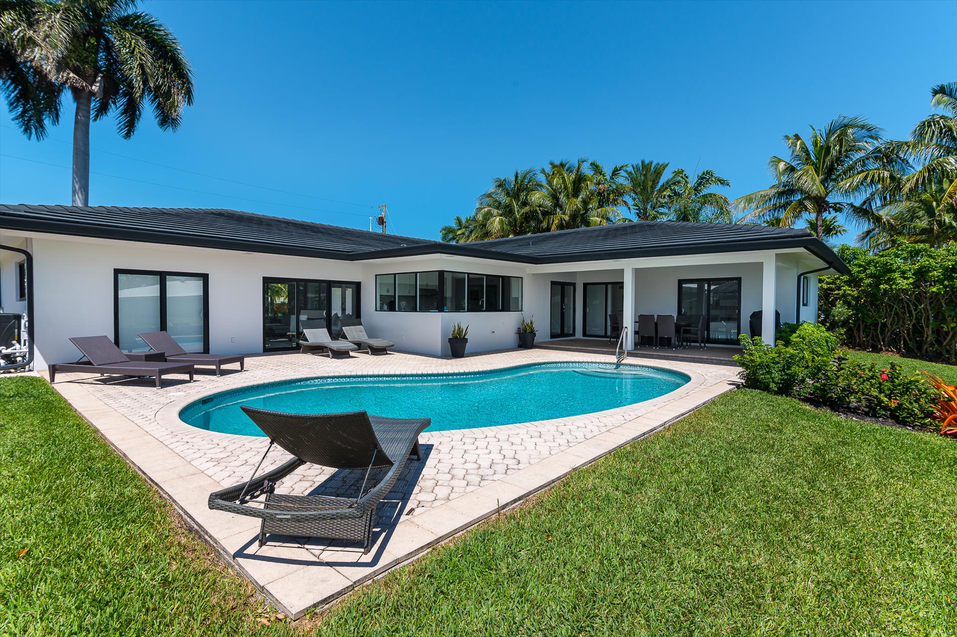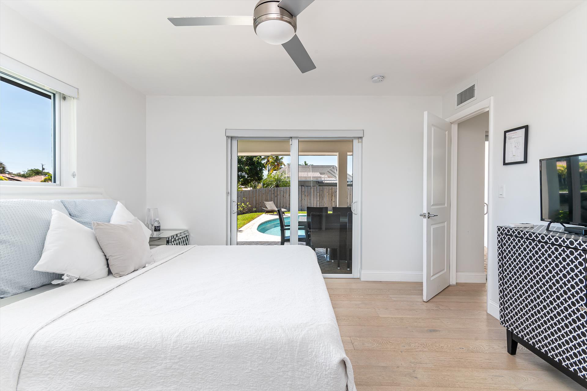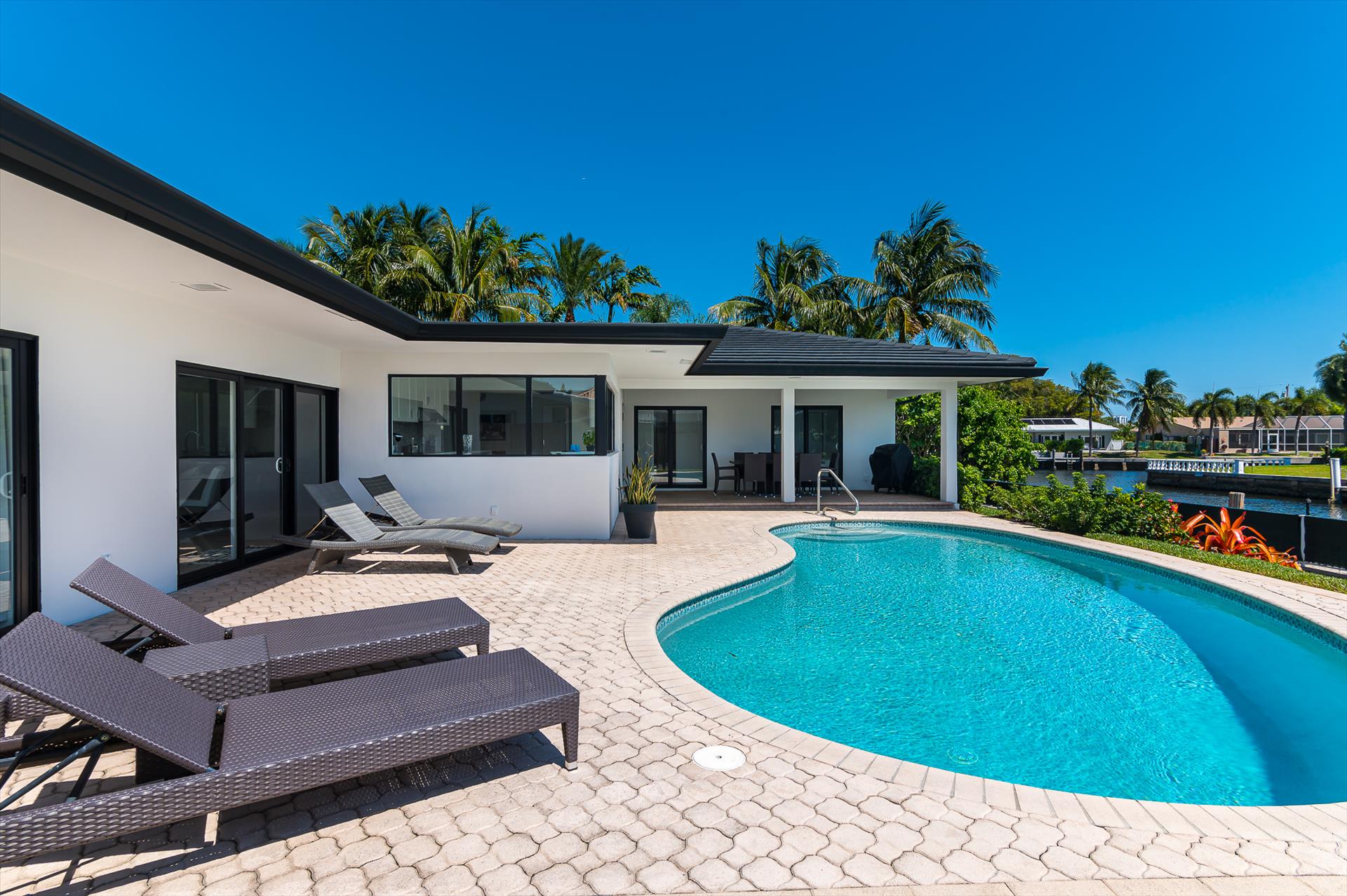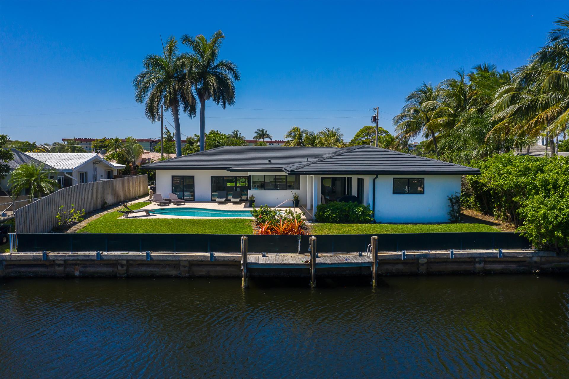 Beautifully decorated villa with an ultra modern motif - 4 Bedrooms/ 3 Bathrooms with over 2,166 of living space boasts with a chick and stylish design. House features updated, fully equipped kitchen with stainless steel appliances, overlooking beautiful pool area and water views, which is a perfect place for those, who like to cook at home ! Modern and sleek dining area is a nice spot for cozy dinners with family and friends. Home features a king size master bedroom with gorgoeus en-suite bethroom , that would make you feel like at the 5 star resort! Second guest bedroom is also en-suite , third guest bedroom features a Queen bed and a connecting bathroom. The fourth bedroom has a little office space and a pull out sofa that creates 2 twin beds. All bedrooms and bathrooms match the contemporary vibe of the house. Gorgeous outside furnished deck with heated pool and grill is a wonderful place, where the whole family can get sun, BBQ, swim! Adults would enjoy sipping the wine , while watching the over the water sunsets and boats passing by . The dock is available for the guests use ( 80 ft waterfront and can fir 70ft boat, fixed bridge clearance is 13'5 and 10'5 over high tide). This vacation villa is perfectly located : you are close to the beach and many water activities. Just off the Commercial Blvd. , with it's enormous choice of restaurants and supermarkets and quick access to the mesmerizing beach! Within 20 min drive to the Las Olas Boulevard with it's fine dining and shopping!