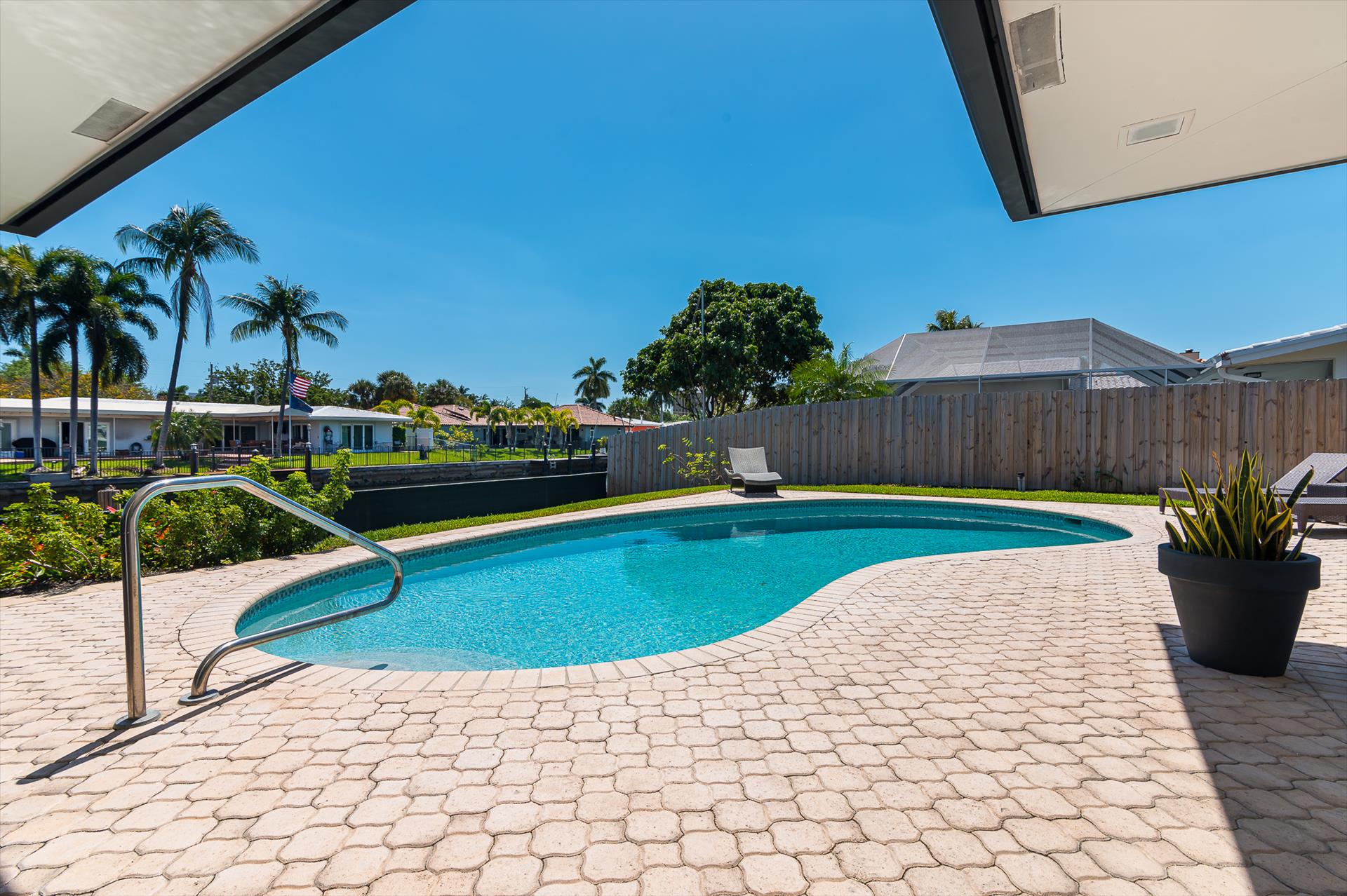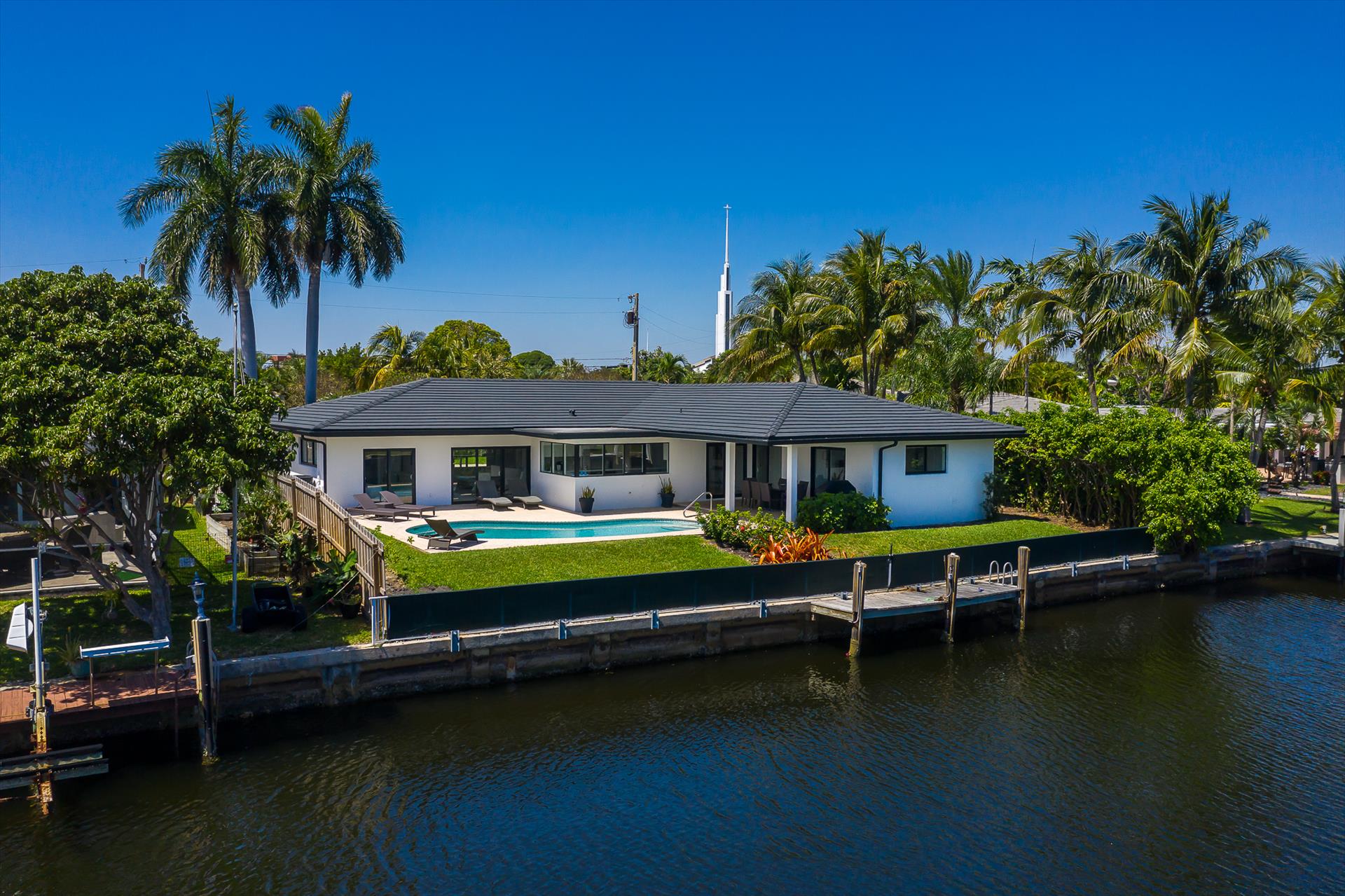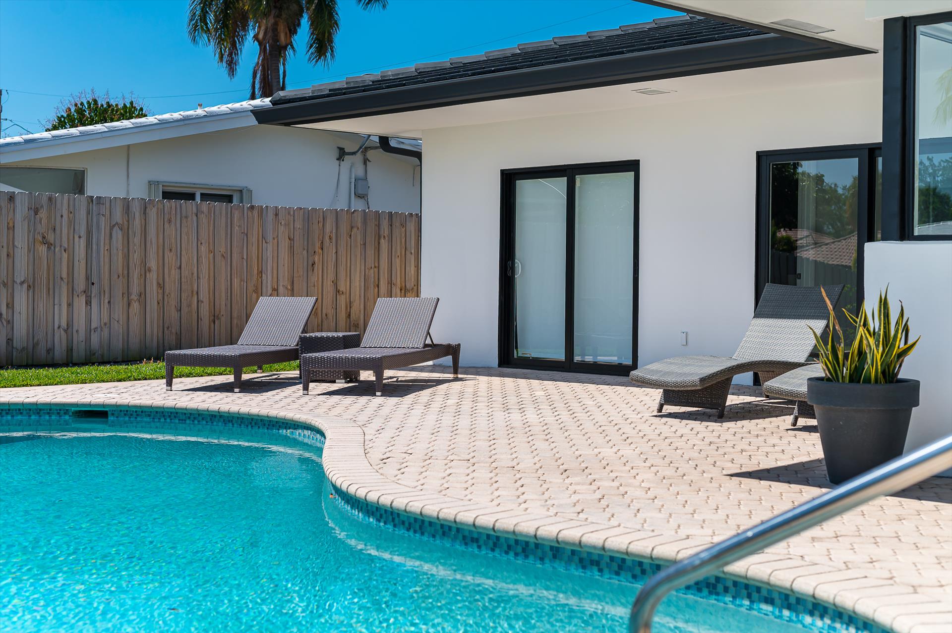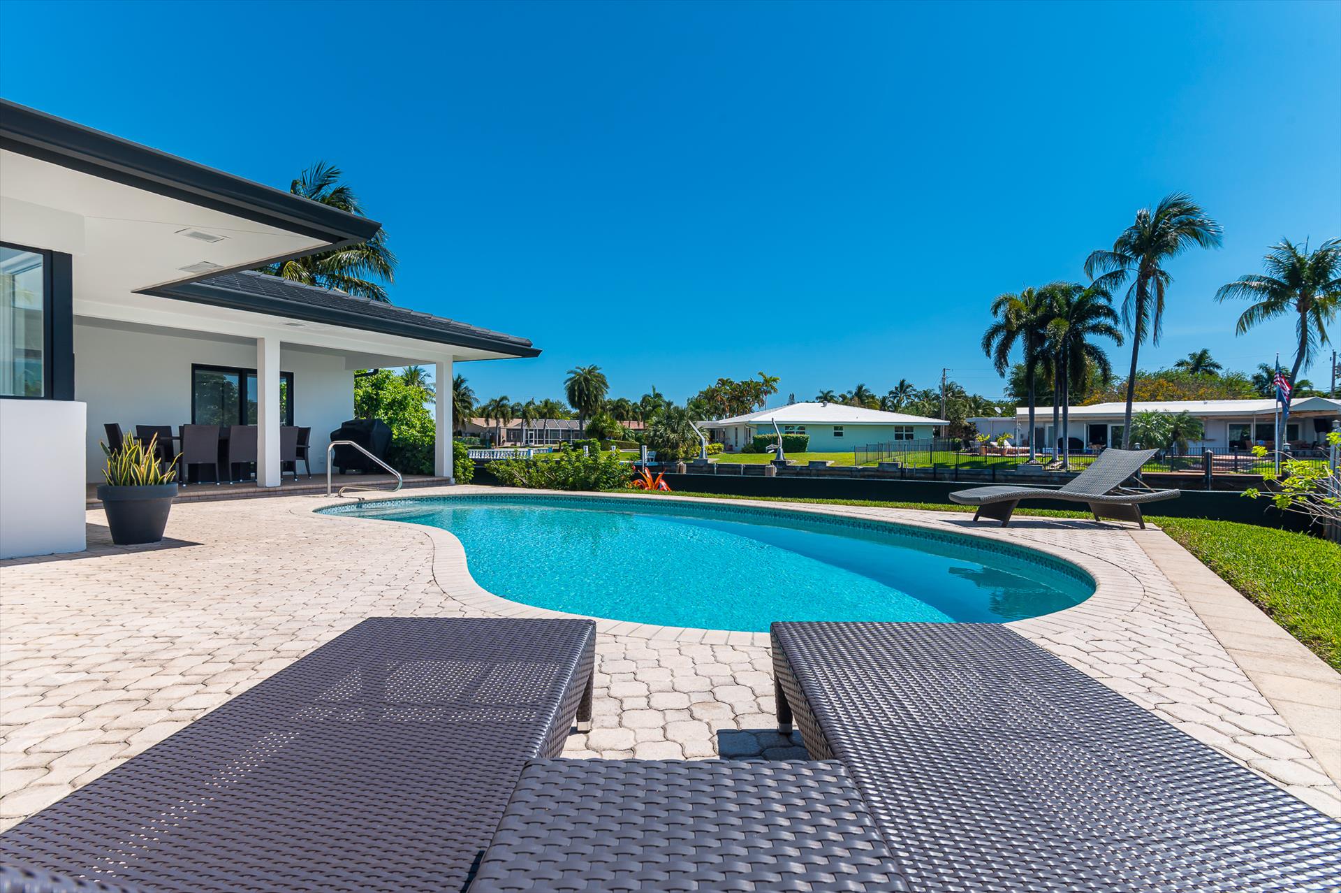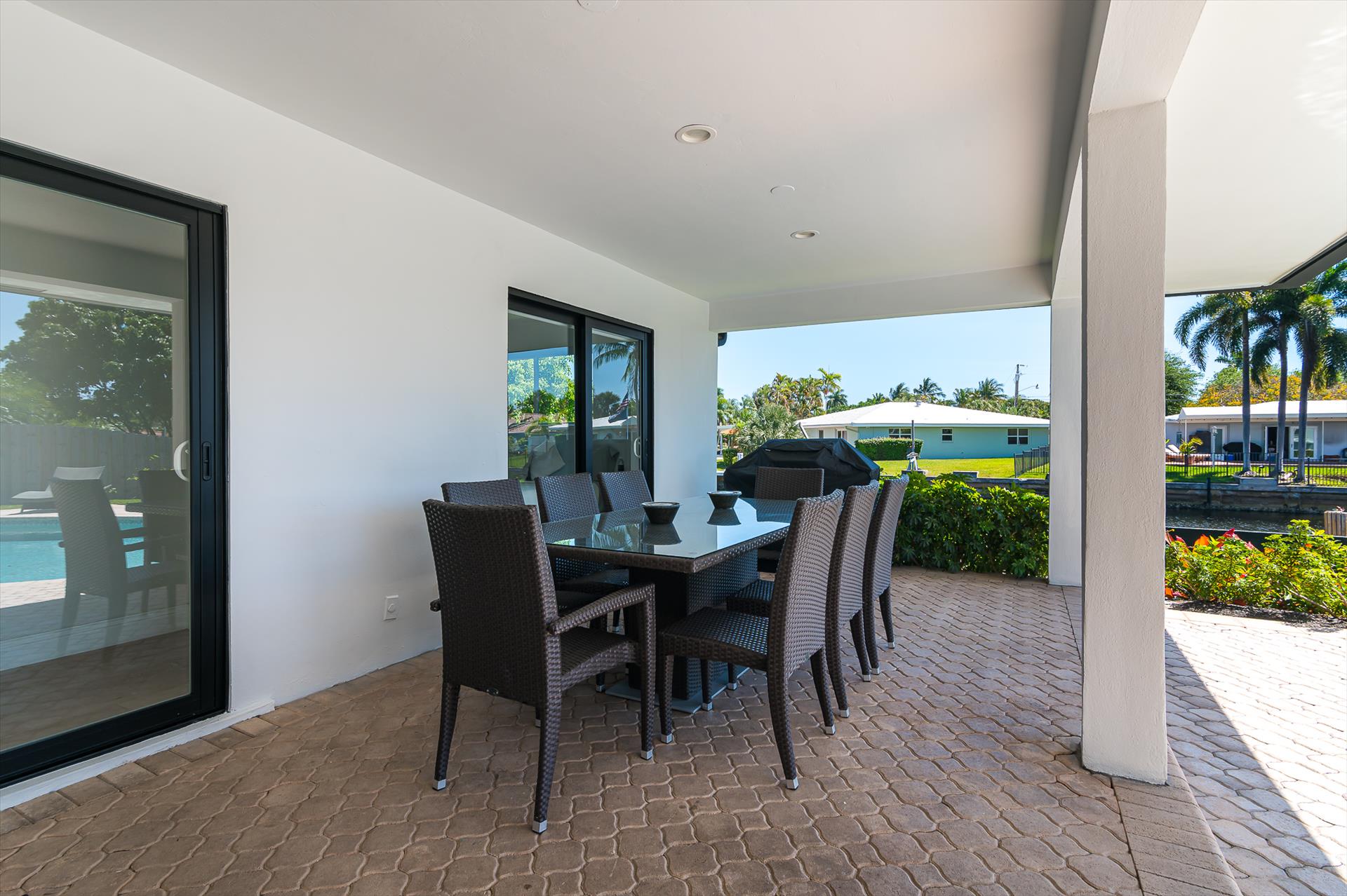 Beautifully decorated villa with an ultra modern motif - 4 Bedrooms/ 3 Bathrooms with over 2,166 of living space boasts with a chick and stylish design. House features updated, fully equipped kitchen with stainless steel appliances, overlooking beautiful pool area and water views, which is a perfect place for those, who like to cook at home ! Modern and sleek dining area is a nice spot for cozy dinners with family and friends. Home features a king size master bedroom with gorgoeus en-suite bethroom , that would make you feel like at the 5 star resort! Second guest bedroom is also en-suite , third guest bedroom features a Queen bed and a connecting bathroom. The fourth bedroom has a little office space and a pull out sofa that creates 2 twin beds. All bedrooms and bathrooms match the contemporary vibe of the house. Gorgeous outside furnished deck with heated pool and grill is a wonderful place, where the whole family can get sun, BBQ, swim! Adults would enjoy sipping the wine , while watching the over the water sunsets and boats passing by . The dock is available for the guests use ( 80 ft waterfront and can fir 70ft boat, fixed bridge clearance is 13'5 and 10'5 over high tide). This vacation villa is perfectly located : you are close to the beach and many water activities. Just off the Commercial Blvd. , with it's enormous choice of restaurants and supermarkets and quick access to the mesmerizing beach! Within 20 min drive to the Las Olas Boulevard with it's fine dining and shopping!