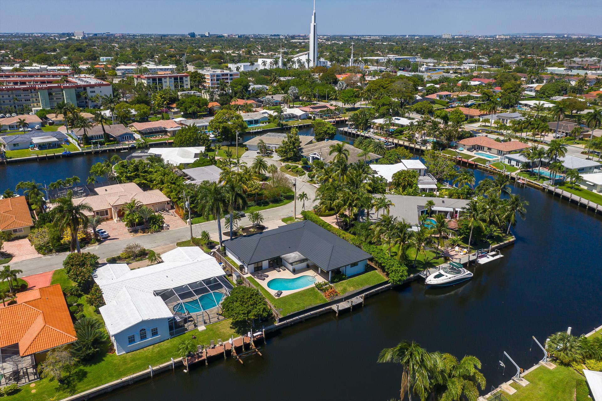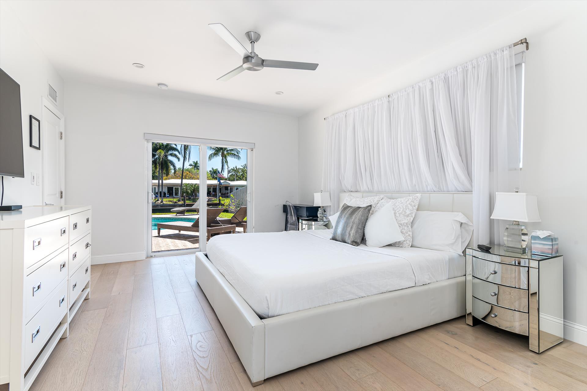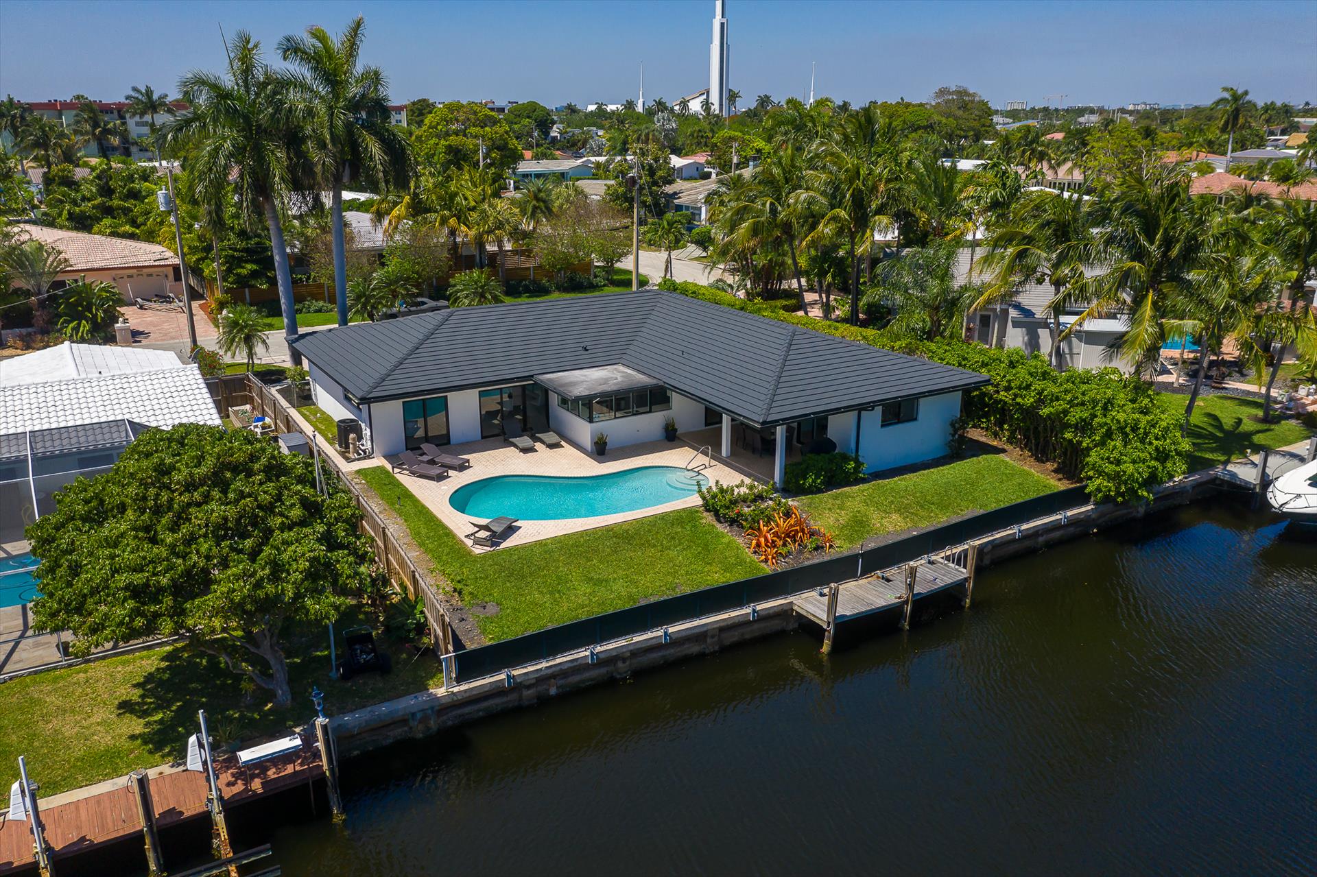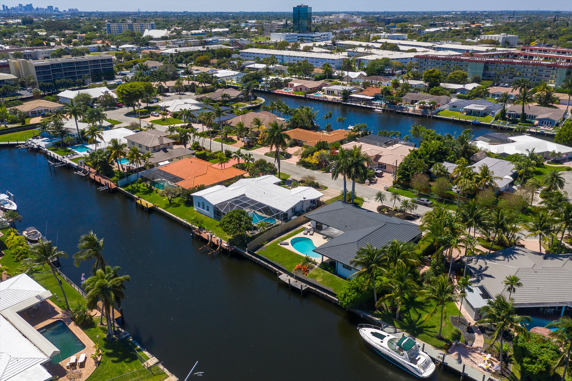 Beautifully decorated villa with an ultra modern motif - 4 Bedrooms/ 3 Bathrooms with over 2,166 of living space boasts with a chick and stylish design. House features updated, fully equipped kitchen with stainless steel appliances, overlooking beautiful pool area and water views, which is a perfect place for those, who like to cook at home ! Modern and sleek dining area is a nice spot for cozy dinners with family and friends. Home features a king size master bedroom with gorgoeus en-suite bethroom , that would make you feel like at the 5 star resort! Second guest bedroom is also en-suite , third guest bedroom features a Queen bed and a connecting bathroom. The fourth bedroom has a little office space and a pull out sofa that creates 2 twin beds. All bedrooms and bathrooms match the contemporary vibe of the house. Gorgeous outside furnished deck with heated pool and grill is a wonderful place, where the whole family can get sun, BBQ, swim! Adults would enjoy sipping the wine , while watching the over the water sunsets and boats passing by . The dock is available for the guests use ( 80 ft waterfront and can fir 70ft boat, fixed bridge clearance is 13'5 and 10'5 over high tide). This vacation villa is perfectly located : you are close to the beach and many water activities. Just off the Commercial Blvd. , with it's enormous choice of restaurants and supermarkets and quick access to the mesmerizing beach! Within 20 min drive to the Las Olas Boulevard with it's fine dining and shopping!