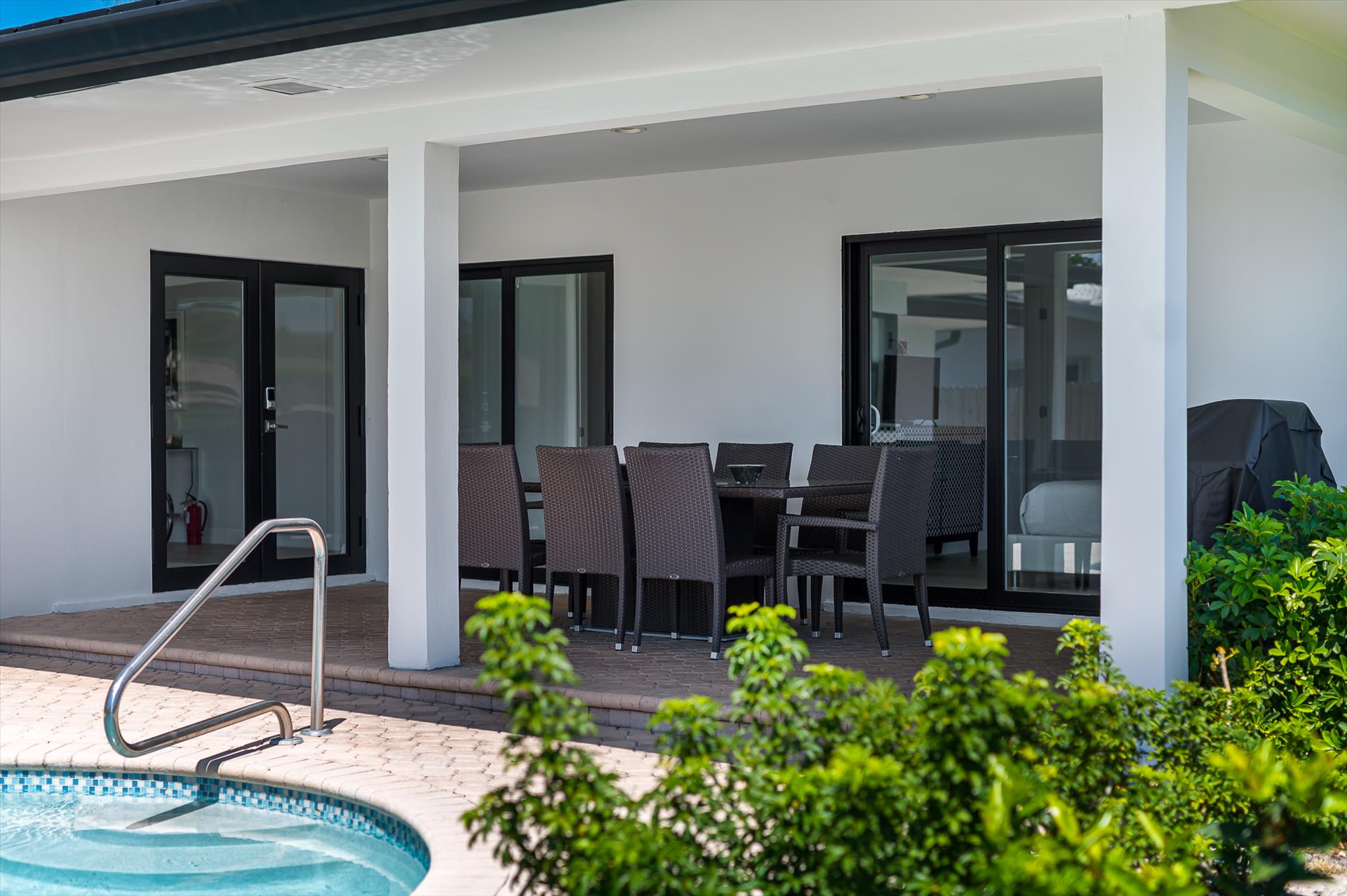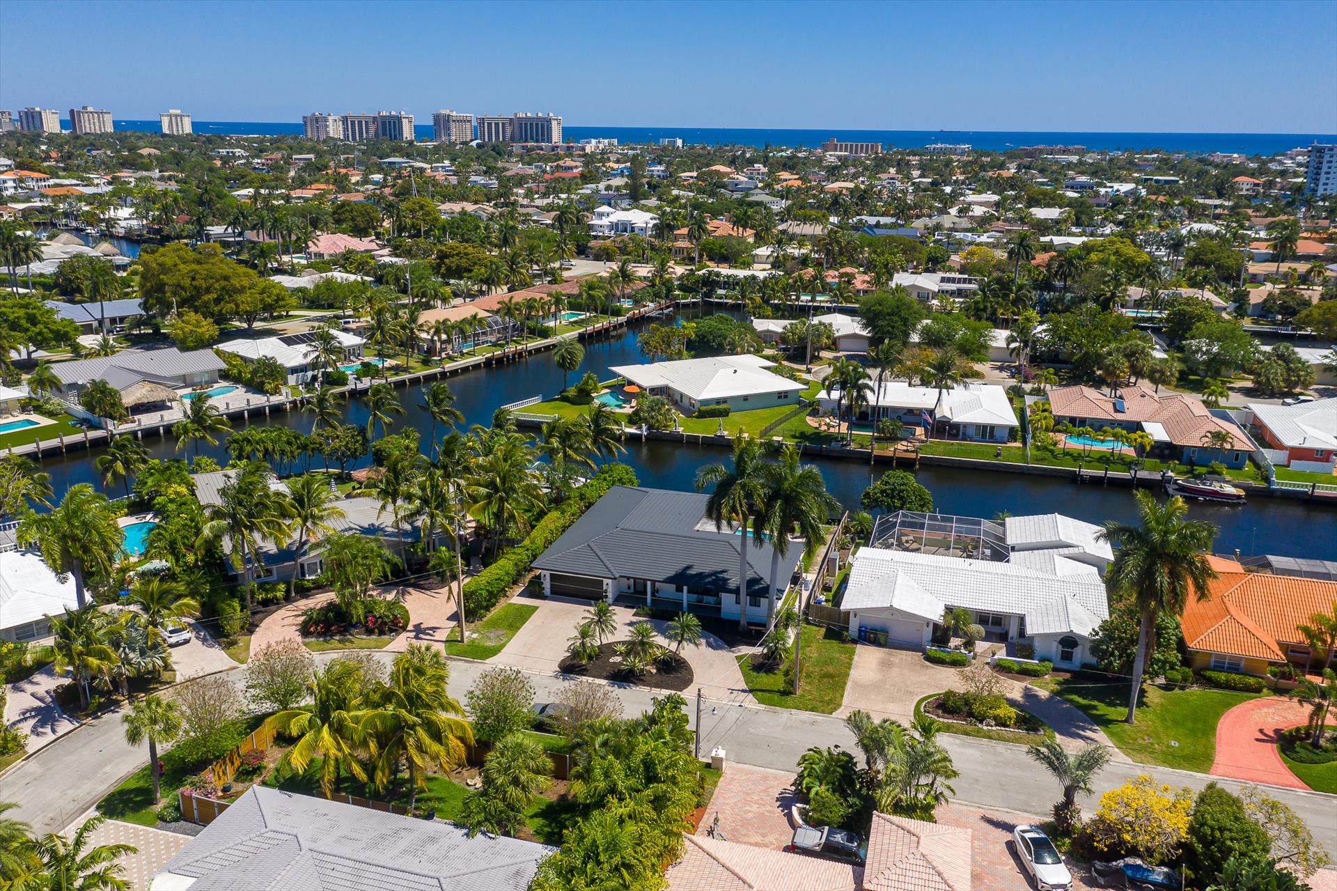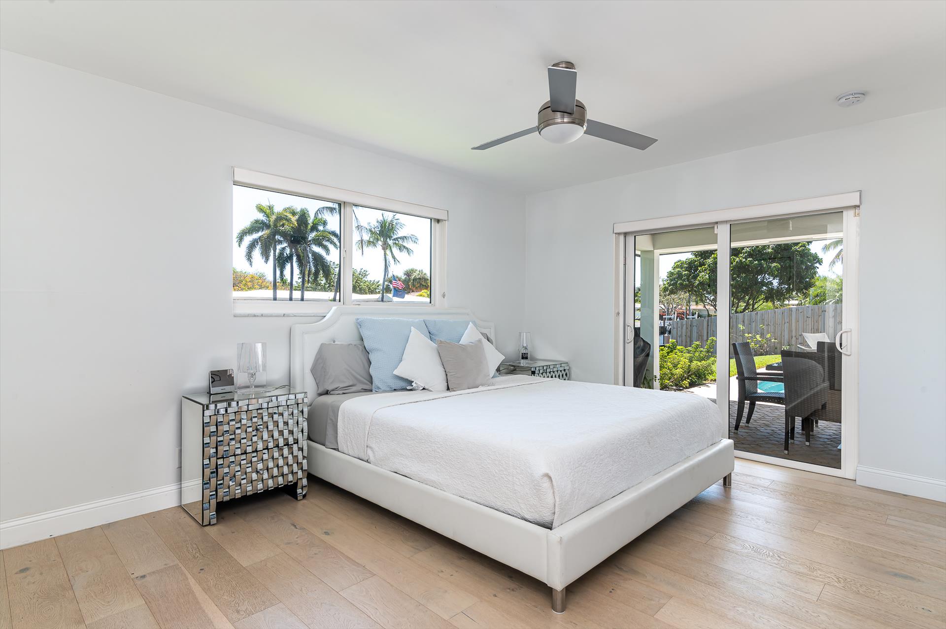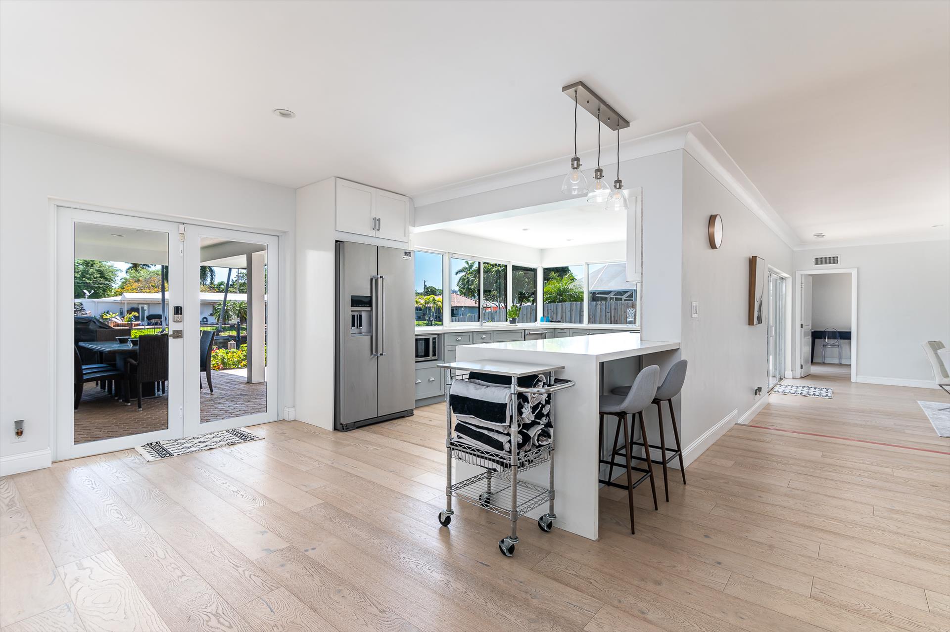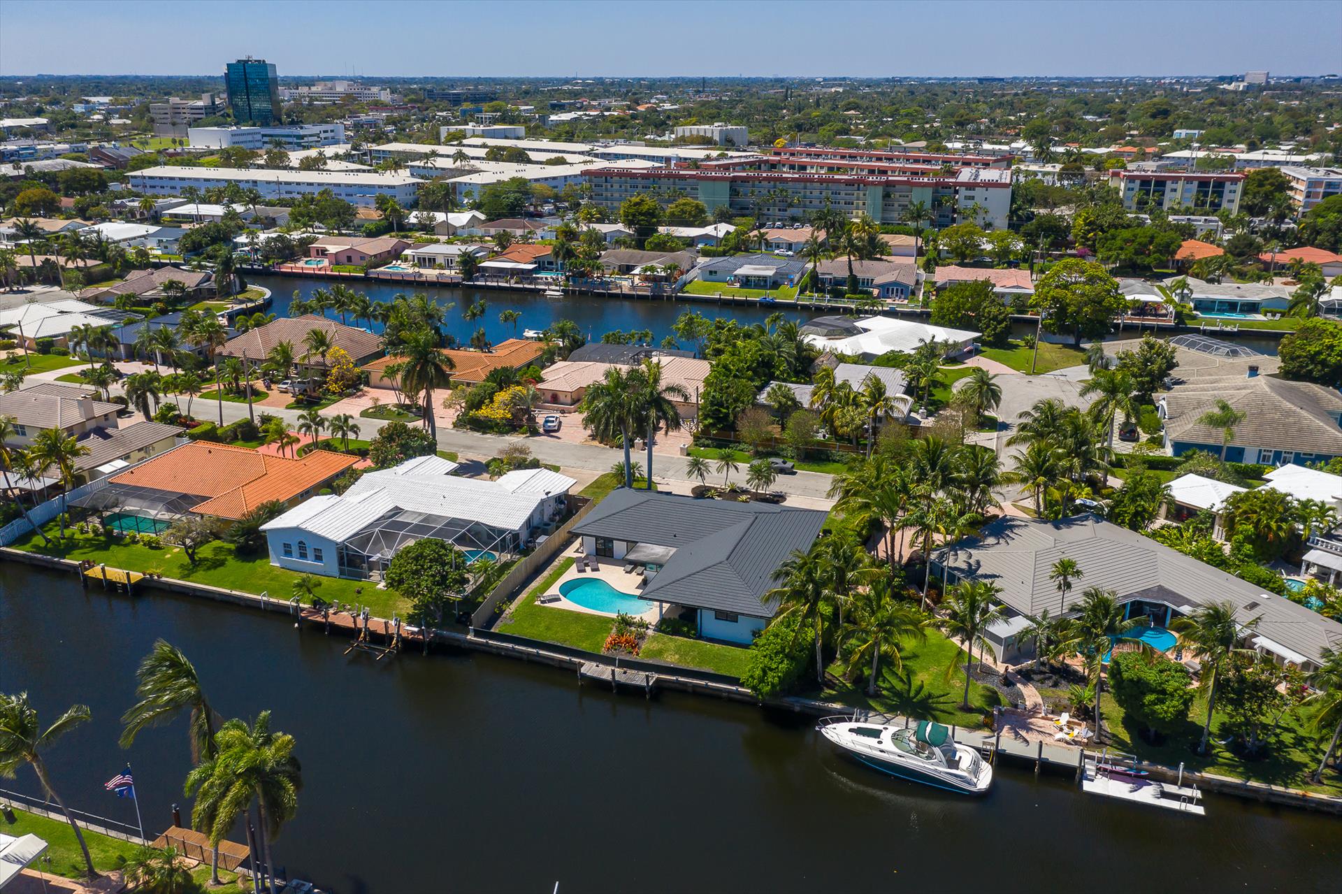 Beautifully decorated villa with an ultra modern motif - 4 Bedrooms/ 3 Bathrooms with over 2,166 of living space boasts with a chick and stylish design. House features updated, fully equipped kitchen with stainless steel appliances, overlooking beautiful pool area and water views, which is a perfect place for those, who like to cook at home ! Modern and sleek dining area is a nice spot for cozy dinners with family and friends. Home features a king size master bedroom with gorgoeus en-suite bethroom , that would make you feel like at the 5 star resort! Second guest bedroom is also en-suite , third guest bedroom features a Queen bed and a connecting bathroom. The fourth bedroom has a little office space and a pull out sofa that creates 2 twin beds. All bedrooms and bathrooms match the contemporary vibe of the house. Gorgeous outside furnished deck with heated pool and grill is a wonderful place, where the whole family can get sun, BBQ, swim! Adults would enjoy sipping the wine , while watching the over the water sunsets and boats passing by . The dock is available for the guests use ( 80 ft waterfront and can fir 70ft boat, fixed bridge clearance is 13'5 and 10'5 over high tide). This vacation villa is perfectly located : you are close to the beach and many water activities. Just off the Commercial Blvd. , with it's enormous choice of restaurants and supermarkets and quick access to the mesmerizing beach! Within 20 min drive to the Las Olas Boulevard with it's fine dining and shopping!