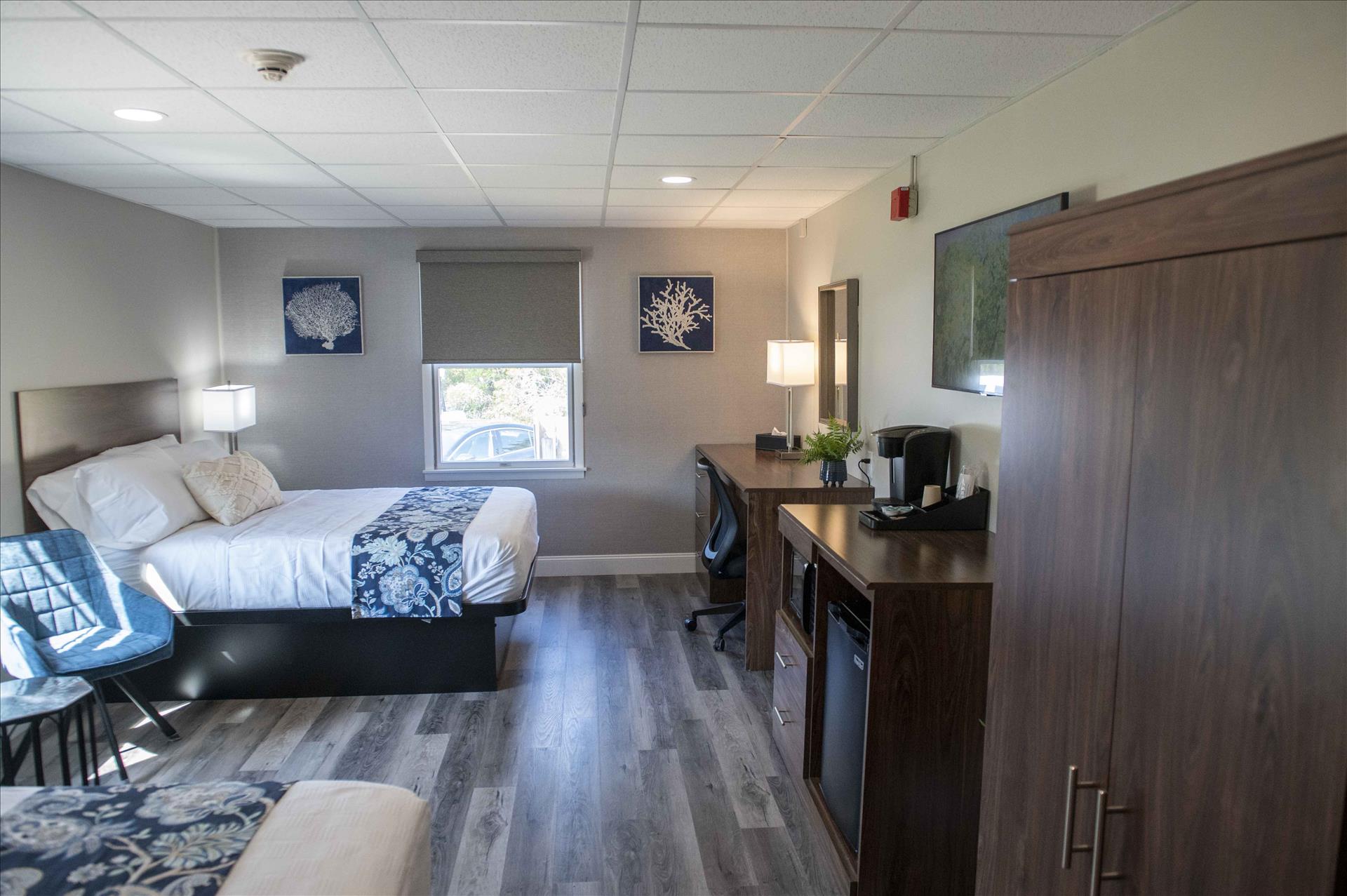 Room B has two queen beds, a full private bath adjacent to the room, a smart TV, Wifi, a mini fridge, a microwave, a Keurig coffee maker, a hair dryer, and an iron/ironing board.